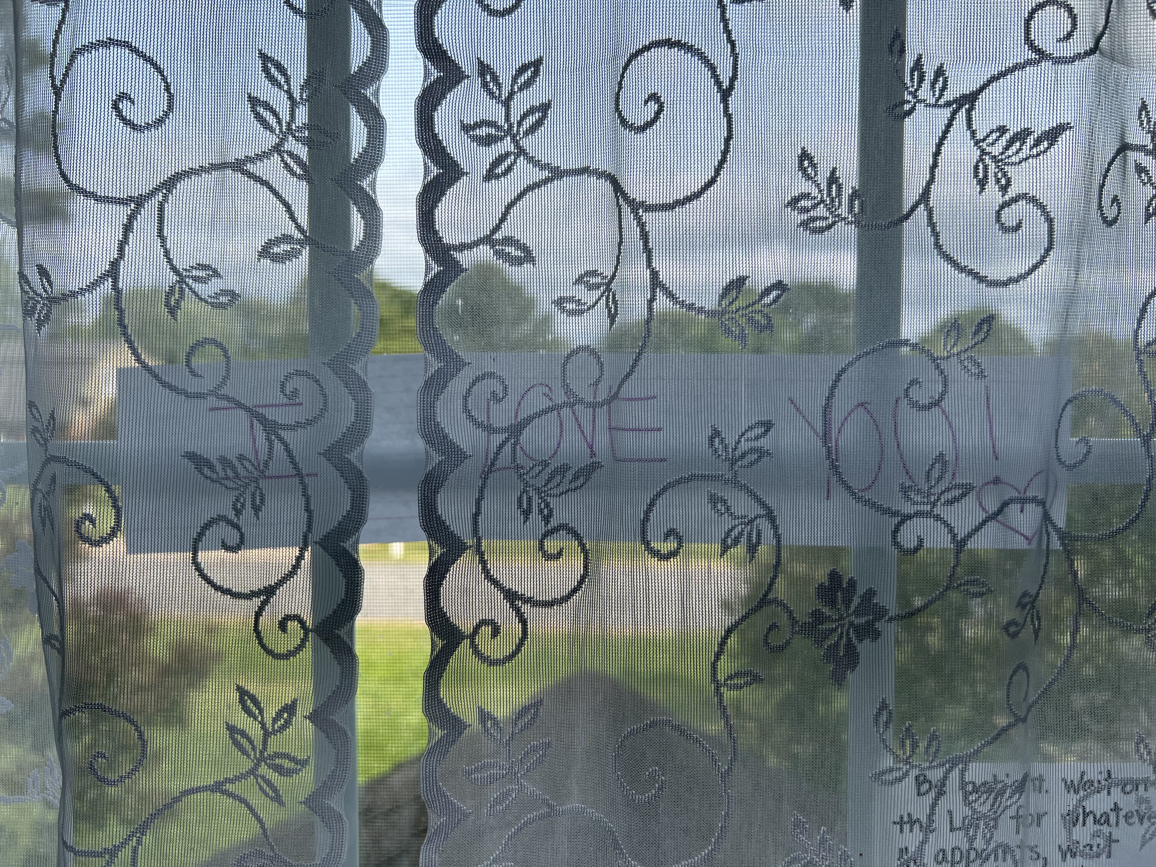 When I moved the desk back to its proper place and set up my laptop to work, I glanced up, and through the curtains, I saw the sweetest thing. My daughter had written in index cards taped together, “I LOVE YOU!” with a heart. That girl. Be still my heart.